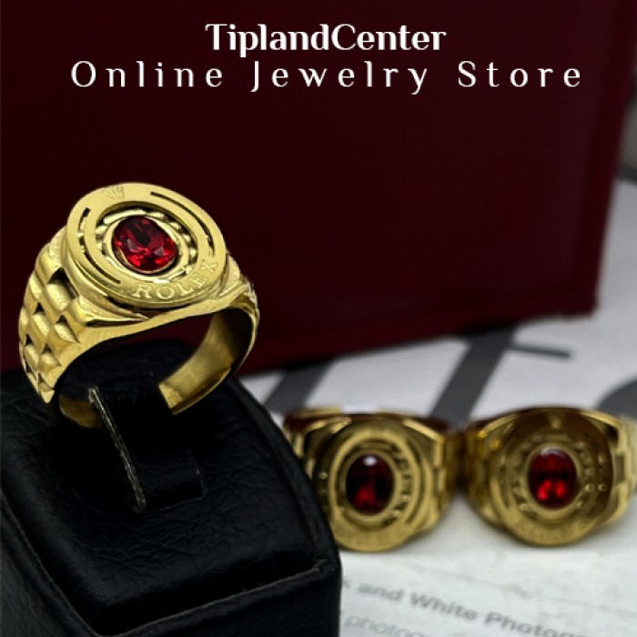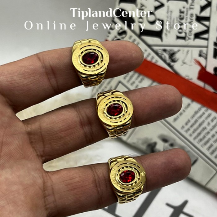 Rolex-Style Men’s Gold-Tone Ring with Red Stone (316L Stainless Steel)