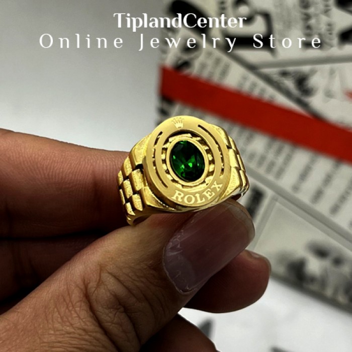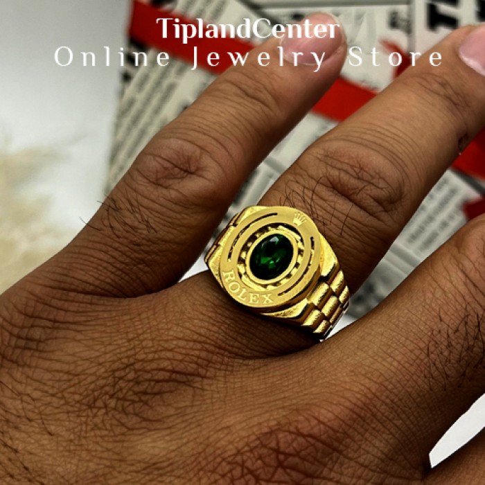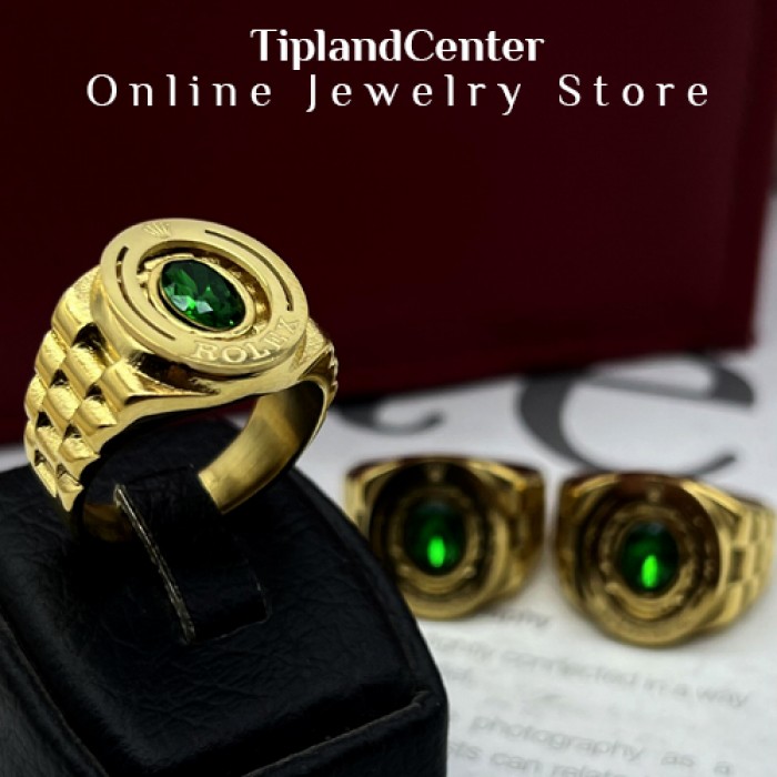 Rolex-Style Men’s Gold-Tone Ring with Green Stone (316L Stainless Steel)
