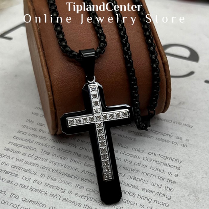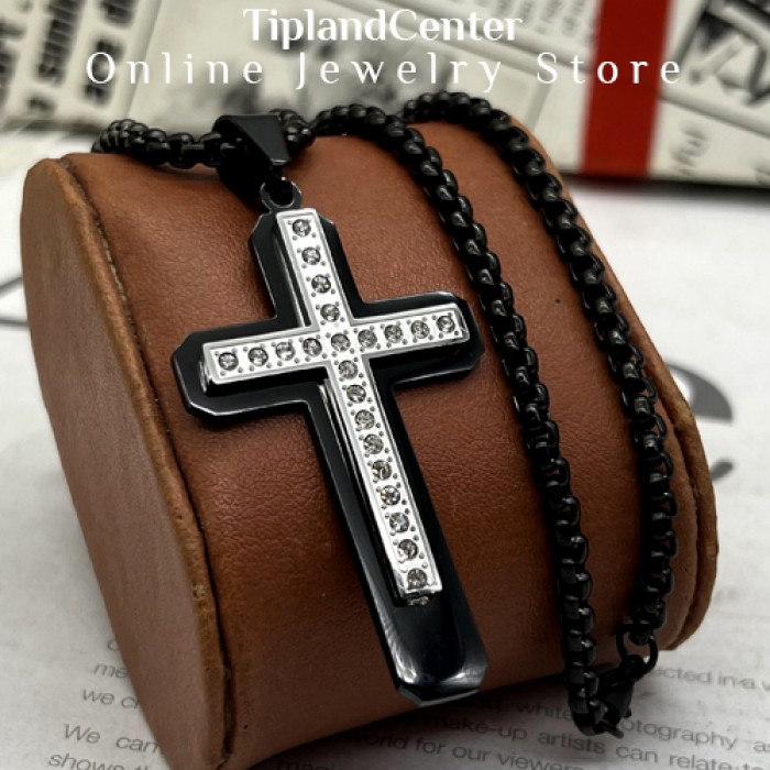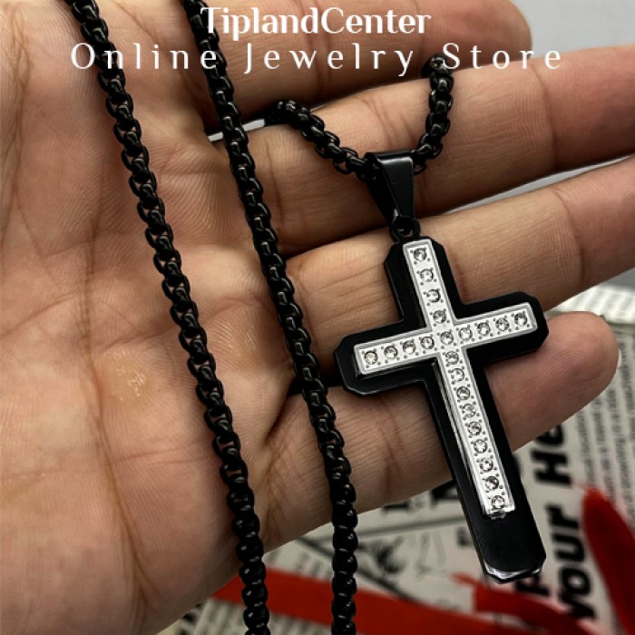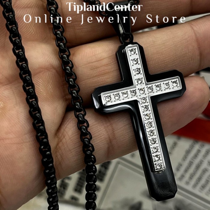 Black Cross Pendant Necklace with Crystals – Stainless Steel