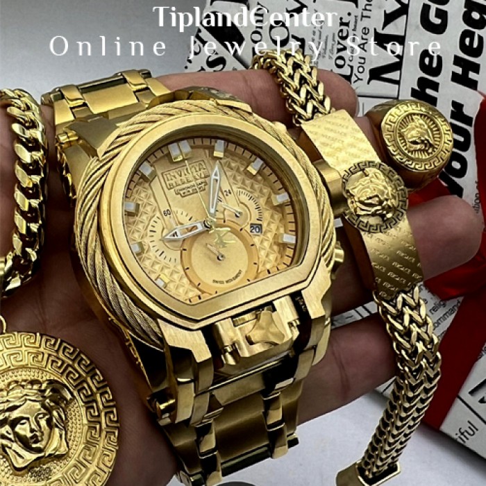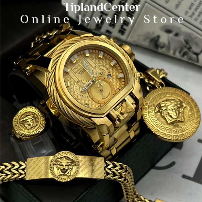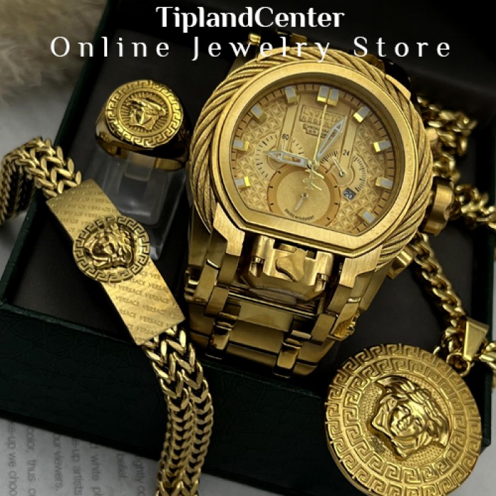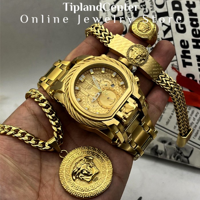 یکی از خاص ترین و زیباترین ست های مردانه کاملا مشابه طلا شامل ساعت دستبند گردنبند انگشتر گودزیلا بوکسل دار رو مشاهده میکنید که این پک یکی از خاص ترین و با ارزش ترین هدیه های مردانه مخصوص تولد و ولنتاین رو رقم زده است.